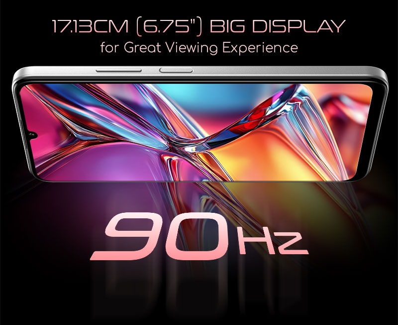 | Screen Size | 17.13cm (6.75") Notch HD+ Display with 2.5D Glass, 90Hz Refresh Rate & Aspect Ratio of 20:9 |